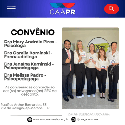 Dra Mary Andréia Pires -Psicóloga Dra Camila Kaminski - Fonoaudióloga Dra Janaína Kaminski - Psicopedagoga Dra Melissa Padro - Psicopedagoga As conveniadas concederão aos(as) advogados(as) 25% de desconto. Rua Rua Arthur Bernardes, 531, Vila do Colégio, Apucarana - PR CAASubseção Apucarana