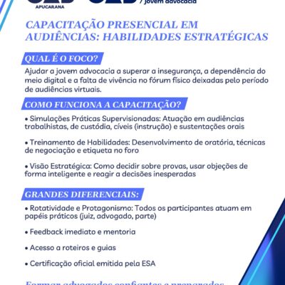 A OAB Apucarana e a CAI Apucarana, convidam a jovem advocacia para participar da CAPACITAÇÃO PRESENCIAL EM AUDIÊNCIAS: HABILIDADES ESTRATÉGICAS Trata-se de um treinamento prático e imersivo onde você terá a oportunidade de assumir, advogado, partes e testemunhas em simulações supervisionadas de audiências trabalhistas, com a mentoria do Juiz Substituto...