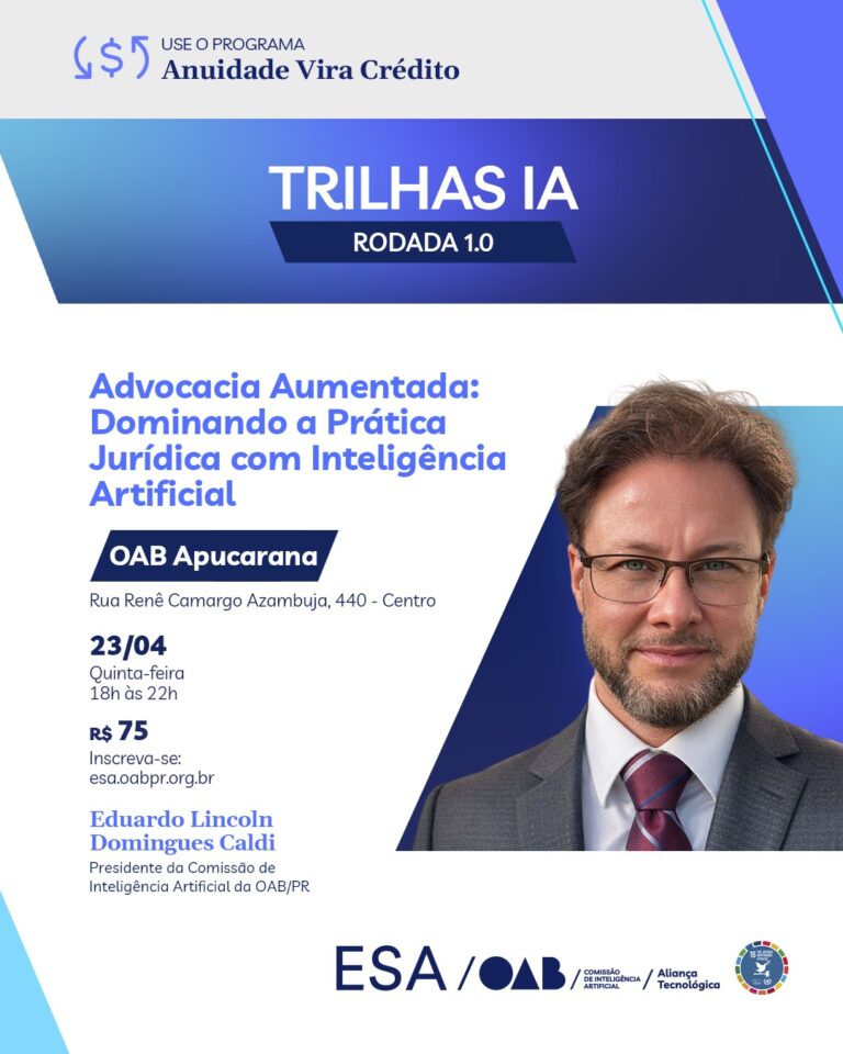 A OAB Apucarana recebe a edição das Trilhas IA – Rodada 1.0, com o tema “Advocacia Aumentada: Dominando a Prática Jurídica com Inteligência Artificial”.